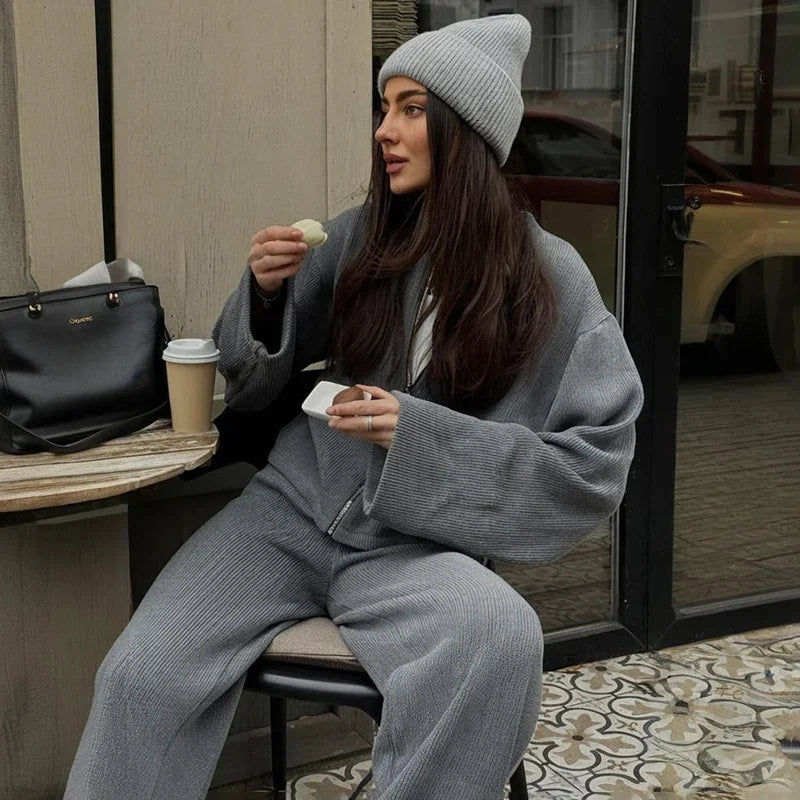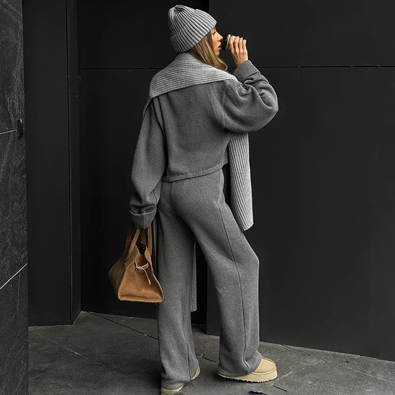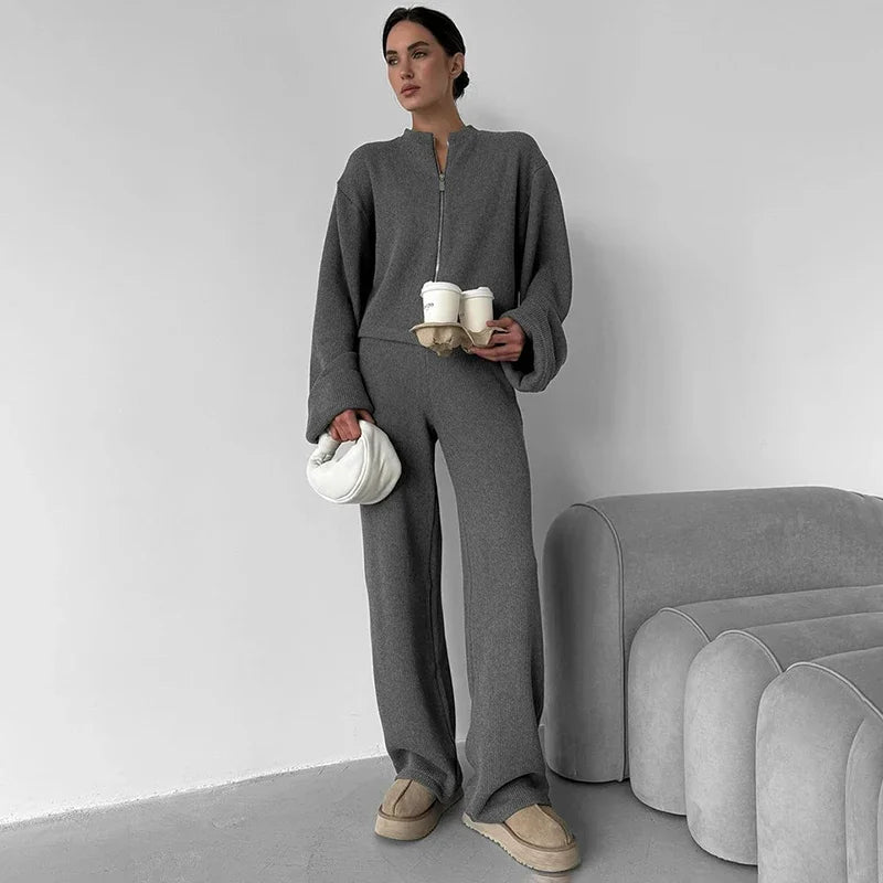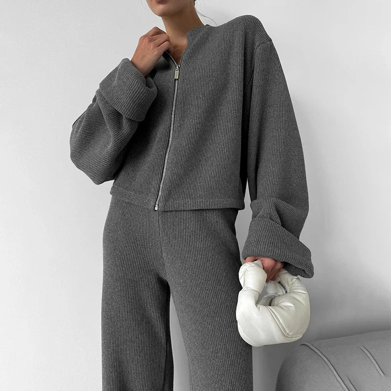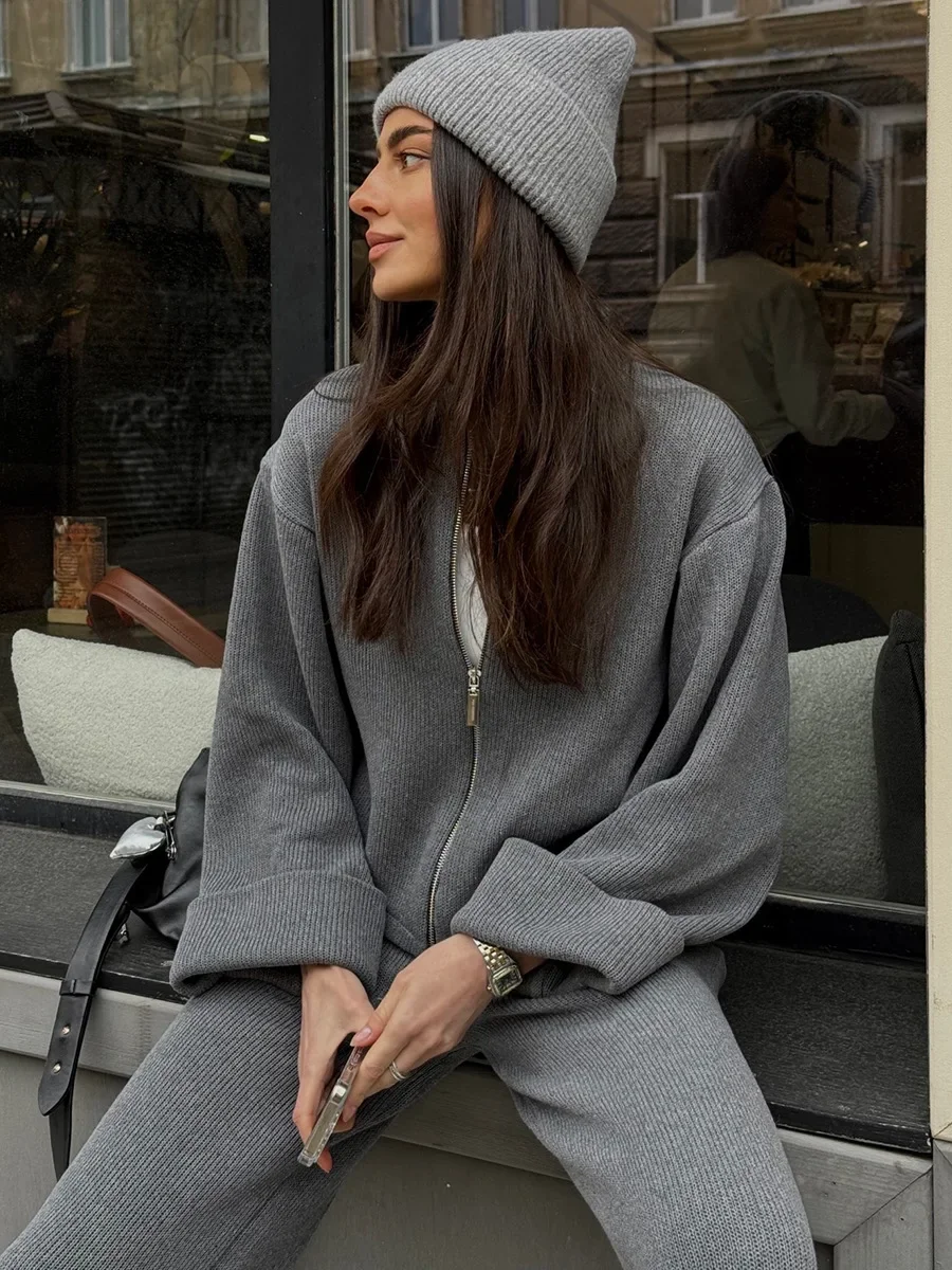 Knitted Long Sleeve Wide-leg Trousers Suit Elegant Women's Zipper Coat Pants Casual Two Piece Set Female Loose Outfits