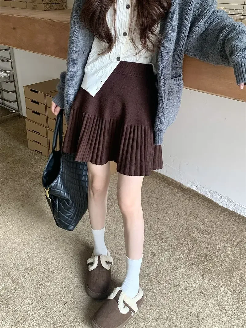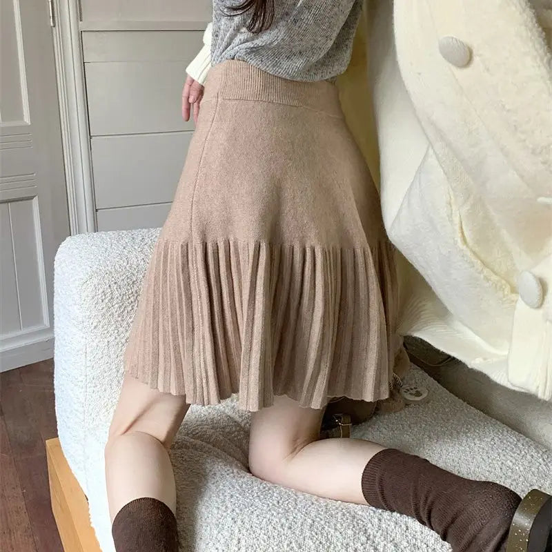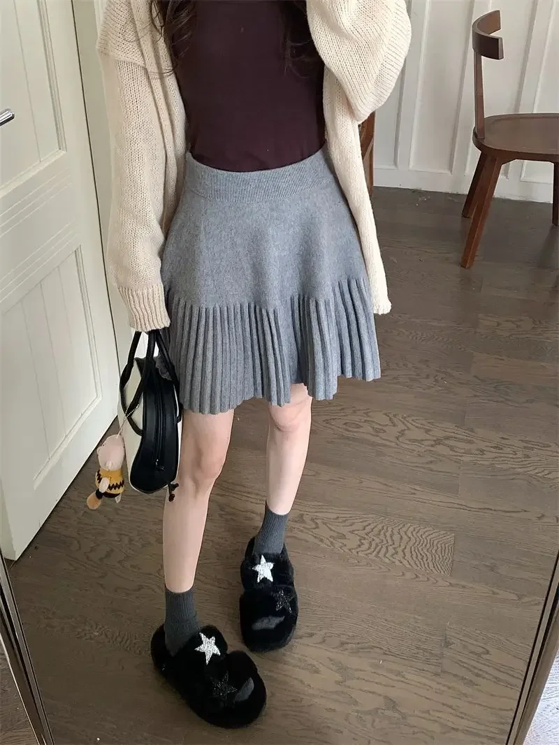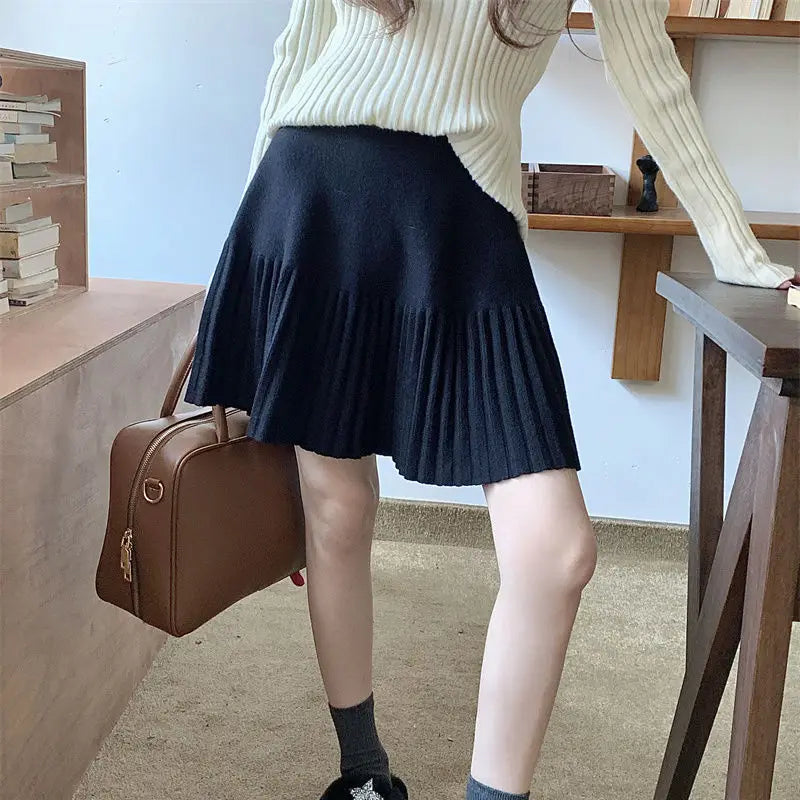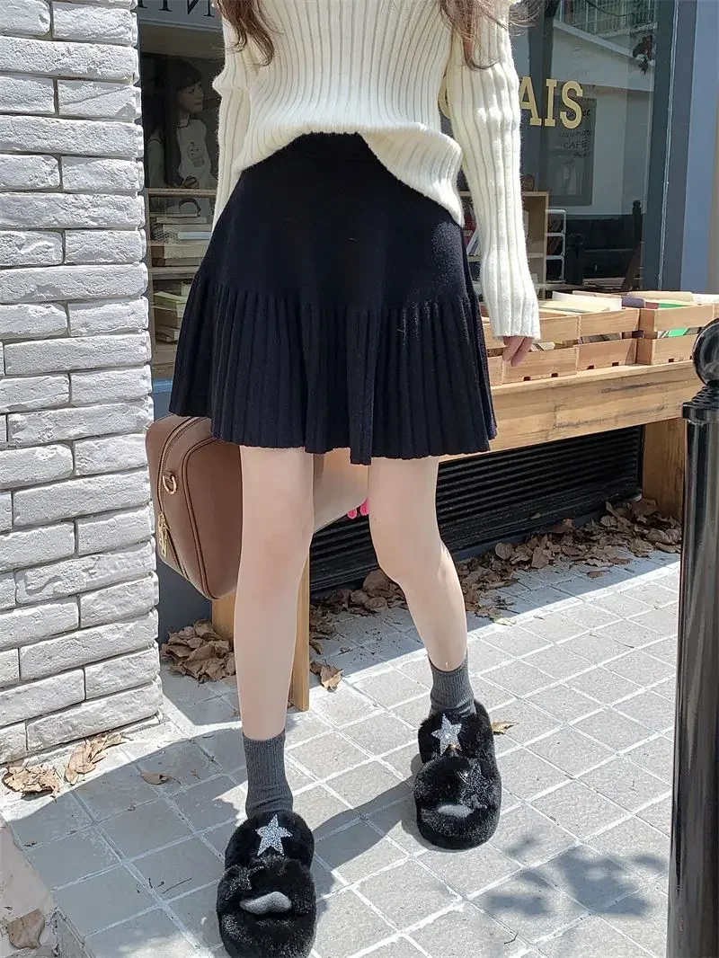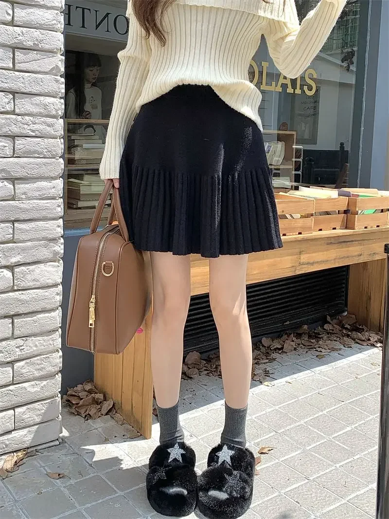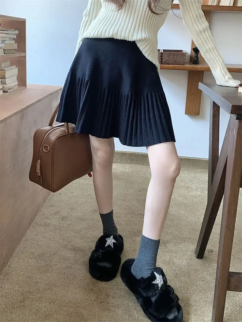 Short skirt knitted half skirt for women in autumn high waisted small A-line pleated skirt design black