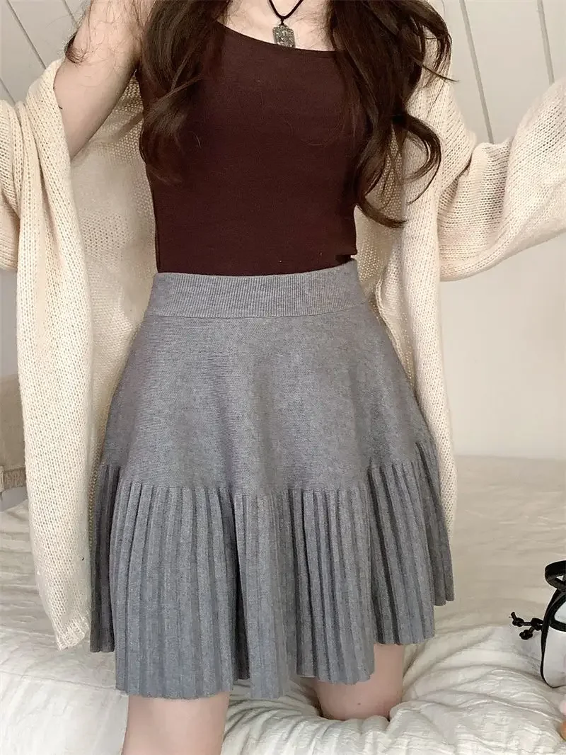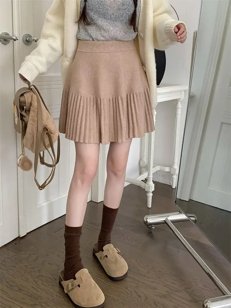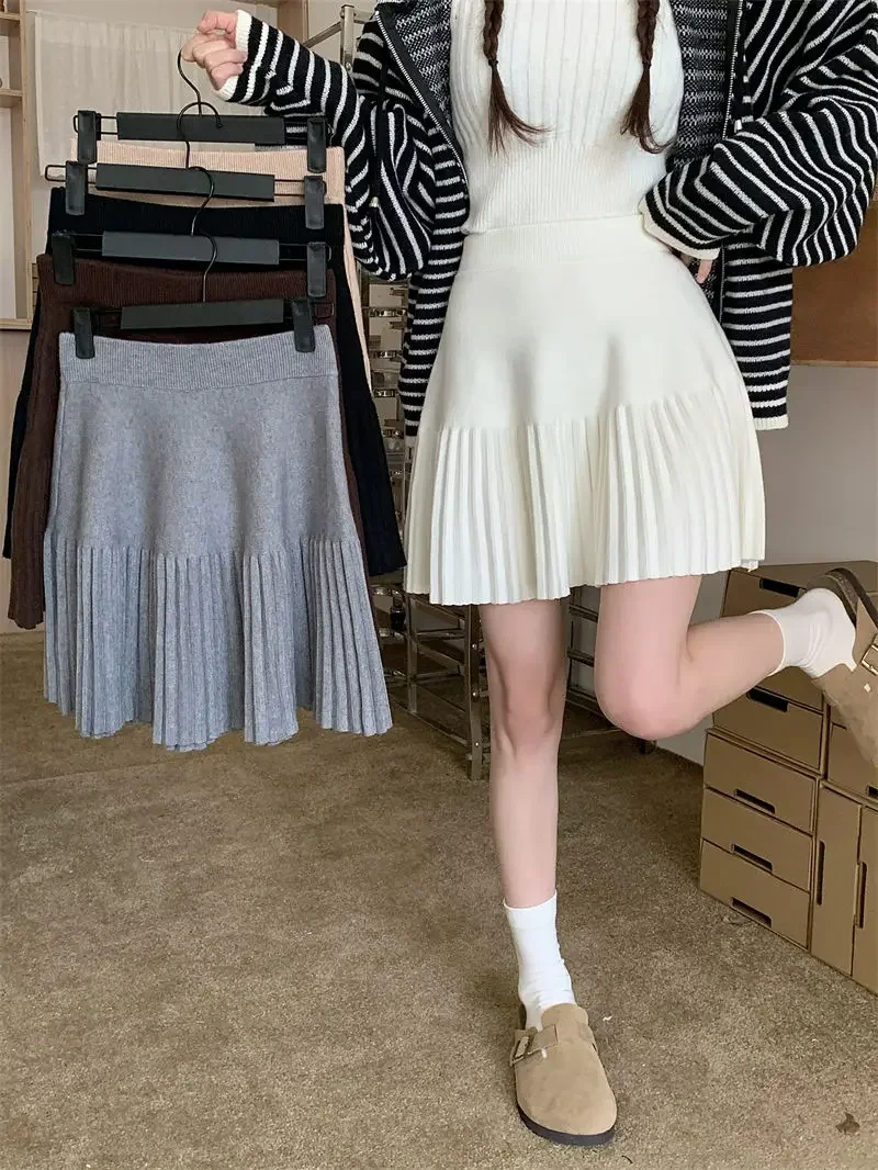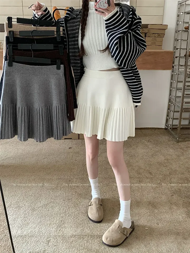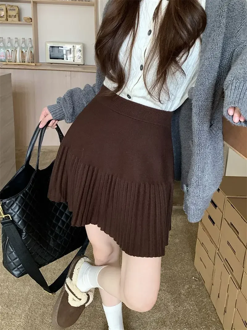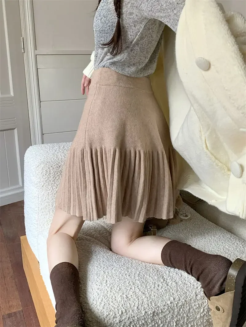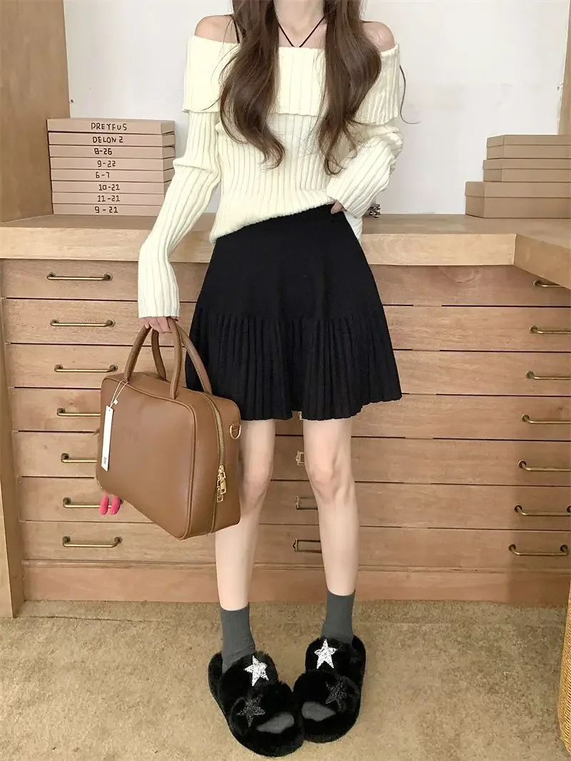 Short skirt knitted half skirt for women in autumn high waisted small A-line pleated skirt design black