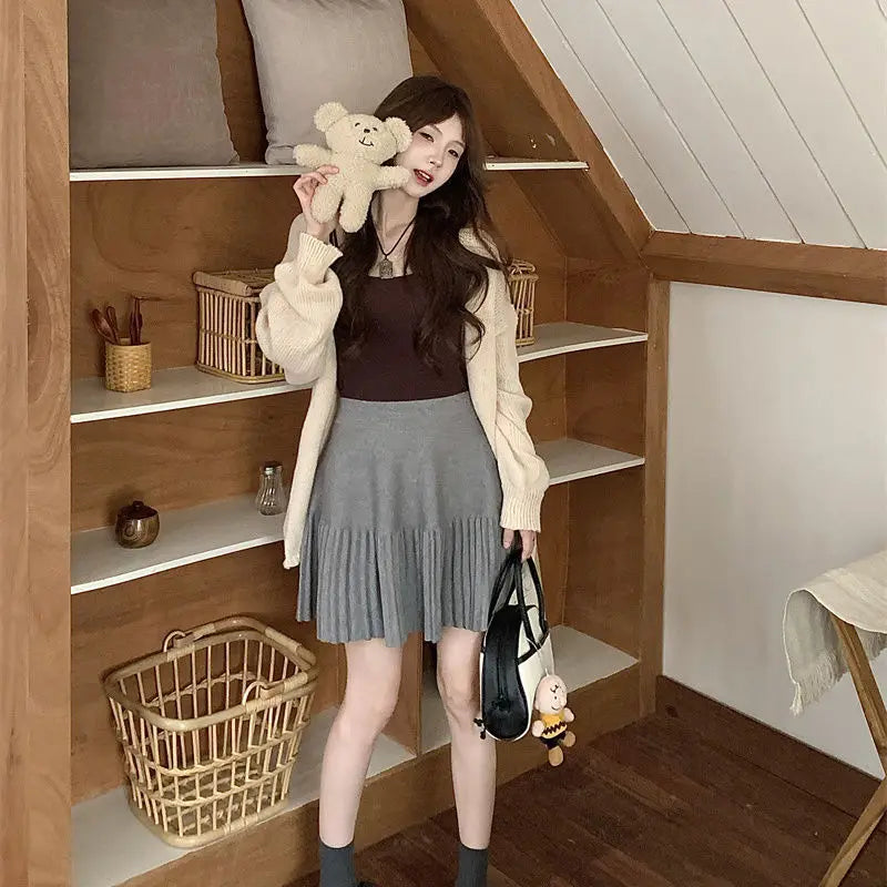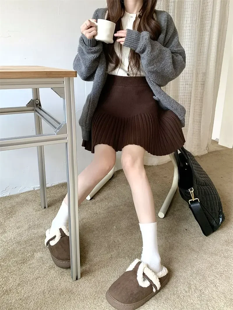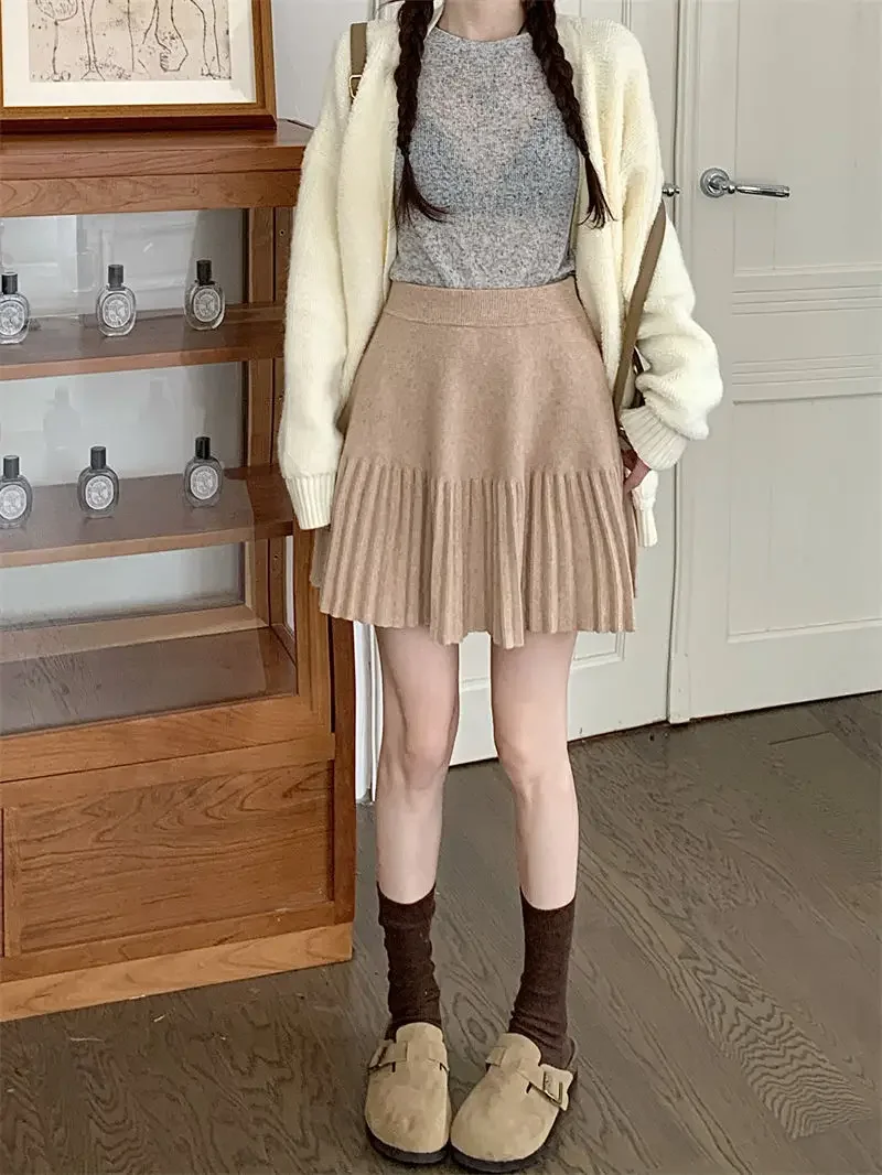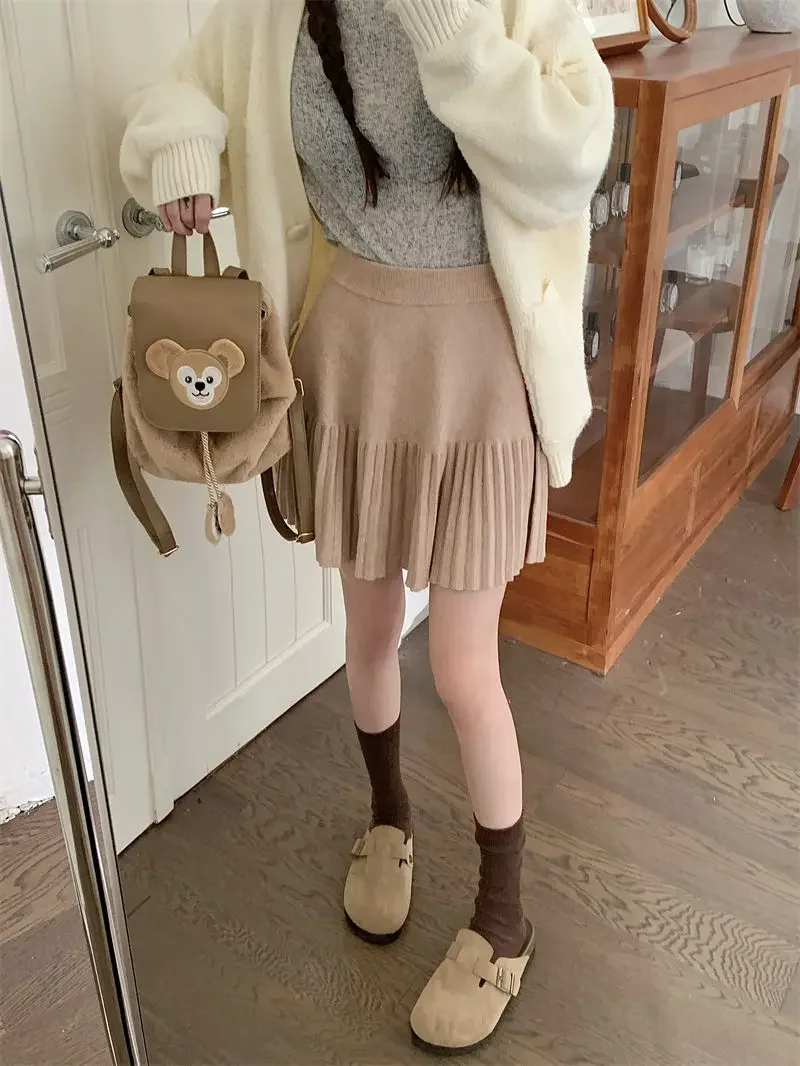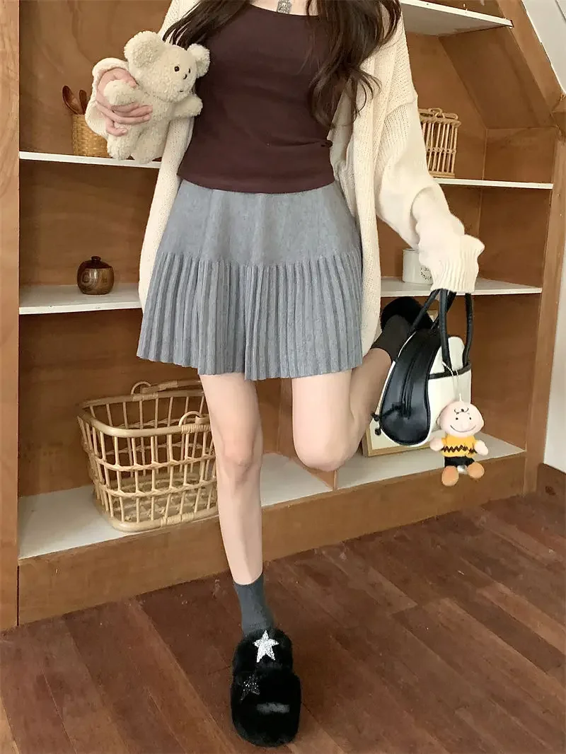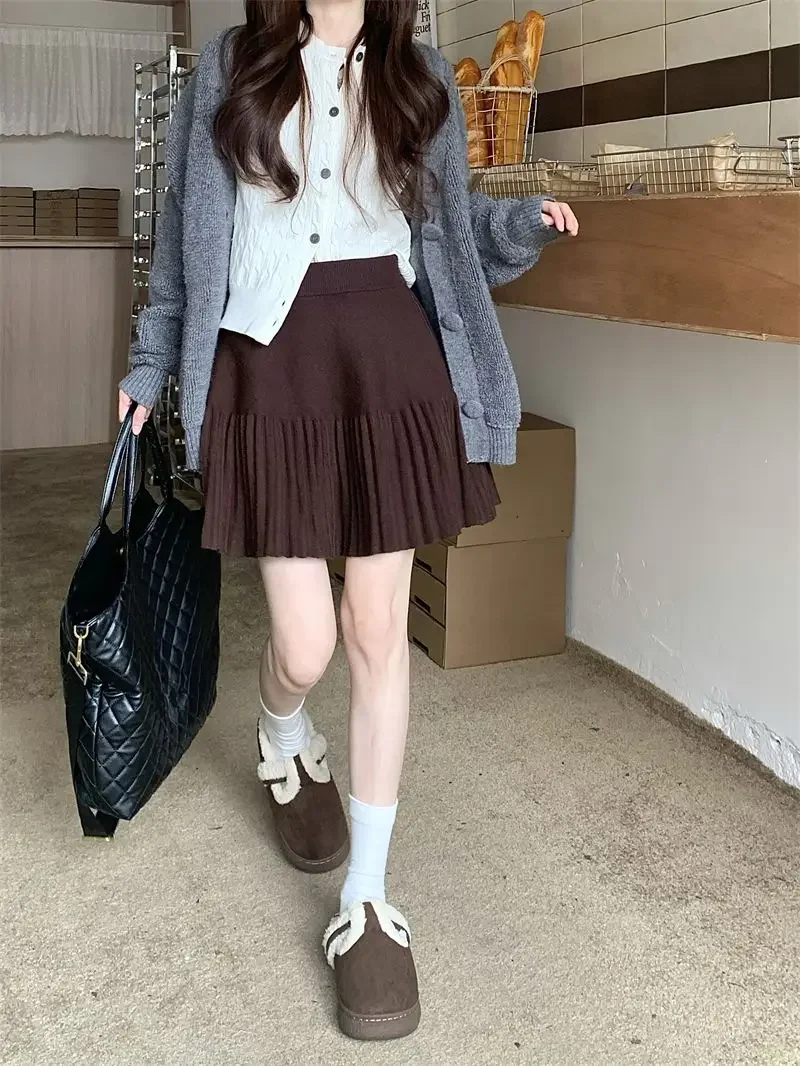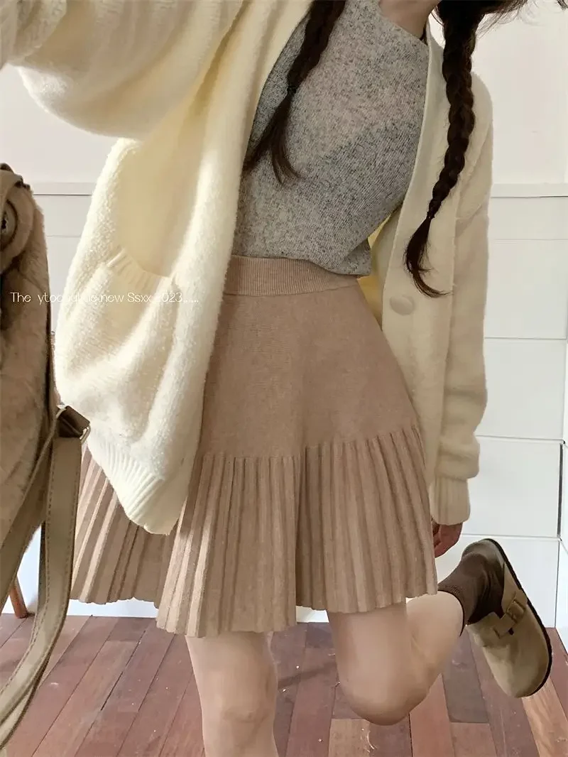 Short skirt knitted half skirt for women in autumn high waisted small A-line pleated skirt design black